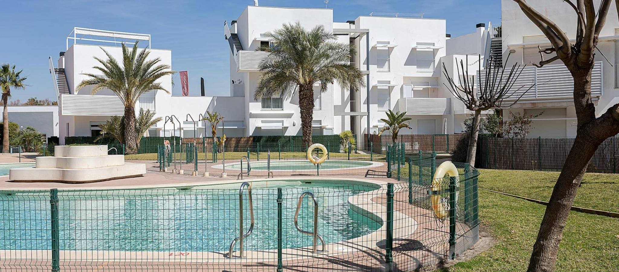 NEW BUILD RESIDENTIAL COMPLEX IN VERA New Build residential of apartments in Vera just 400m from the huge Vera beach named "El Playazo". The typologies are ground floor with two private gardens, one in each orientation, which allows you to enjoy sun or shade whenever you want depending on the time of day or the season of the year. The first floors have terraces and the penthouses have large solariums. All the apartments have extra height ceilings (2.95 m) providing a great feeling of spaciousness. The kitchen comes fully furnished and equipped integrated with the living-dining area with a bar area. The doors and fitted wardrobes are lacquered in white and the floor is made of laminated wood. The hot-cold air conditioning and the hot water are generated by a state-of-the-art DAIKIN Aerothermal device, a technology that saves up to 70% of electricity consumption compared to traditional systems. All bathrooms come with a shower instead of a bathtub, with recessed mirrors and also with a stone countertop and glass partition in the main bathroom. The blinds in the living room and master bedroom are electric, hermetically sealed and with adjustable slats. The gardens and solarium are delivered with the floors finished combining artificial grass and a beautiful paving imitating wood. Each house includes a private outdoor parking space. Each block of the promotion has an independent elevator. Both the buildings and the apartments have a series of bioclimatic architecture characteristics (orientation, insulation, windows and shutters, pergolas) that allow optimal natural regulation of ventilation, temperature and light throughout the different seasons of the year. The communal areas are made up of pedestrian squares and green areas, with a large swimming pool for adults and another for children in the central square. The entire urbanization is free of architectural barriers for the disabled. Here tranquillity and relaxation are guaranteed. Vera is one of the best naturist places in Europe, recognized for the quality and purity of their waters. It offers six kilometres of beaches (Las Marinas-Bolaga, Puerto Rey, El Playazo, Quitapellejos). Vera bordering with the famous tourist destinations such as Mojacar and the Almanzora Caves. Residential complex located about 1,5 hour drive away from Murcia - Corvera airport and about 2 hours away from Alicante airport.