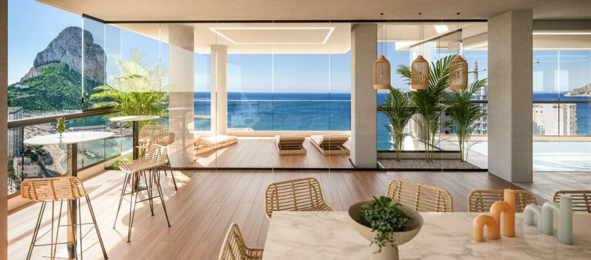 NEW BUILD APARTMENTS WITH THE SEA VIEWS IN CALPE New Build residential complex of 1, 2 and 3 bedrooms apartments with large terraces in Calpe. Two towers of 18 floors with beautiful apartments with views of the sea and the salt lake of Calpe. Complete installation of ducted air conditioning, with pump of cold and heat, by aerothermal control thermostat in living room. Large common areas with gardens, swimming pool, paddle tennis, children's area. On 11th floor of tower 1: infinity pool, sauna, gym and chill area out with sea views. Calpe, one of the towns of La Marina Alta, lies on the northern coast of the province of Alicante, surrounded by the towns of Altea, Benidorm, Teulada-Moraira, Benissa. Calpe has a wonderful mixture of old Valencian culture and modern tourist facilities. It is a great base from which to explore the local area or enjoy the many local beaches. Calpe alone has three of the most beautiful sandy beaches on the coast. Calpe also has two Sailing Clubs: Real Club Náutico de Calpe and Club Náutico de Puerto Blanco. Fishing village of Calpe now transformed into a tourist magnet, the town sits in an ideal location, easily accessed by the A7 motorway and the N332 that runs from Valencia to Alicante; its approximately 1 hour drive from the airport at Alicante and 1,5 hours to Valencias airport.
