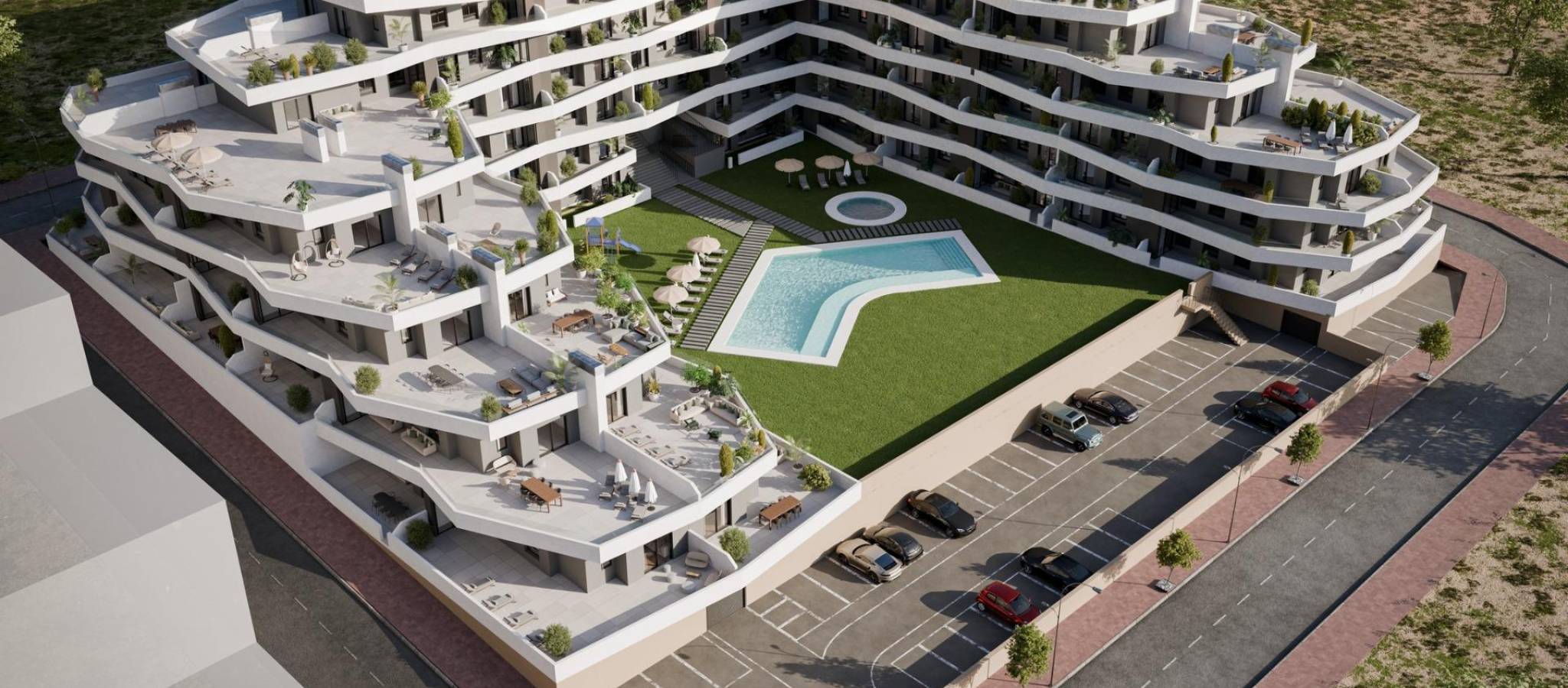Discover Modern Living at the New Residential Development in San Miguel de Salinas Spacious Apartments with Stunning Amenities This new construction residential complex in San Miguel de Salinas offers contemporary 2- and 3-bedroom apartments with expansive terraces, thoughtfully distributed across seven floors. The gated community provides top-notch facilities, including separate swimming pools for adults and children, lush green areas, a children’s playground, and an adult wellness zone with a biosaludable circuit. Prime Location on the Costa Blanca Nestled in the charming town of San Miguel de Salinas, this development enjoys a strategic location on the Costa Blanca. It’s within walking distance of the town center, where you’ll find all the essential services for daily living, including shops, restaurants, and healthcare facilities. The property is a short drive from several points of interest: Las Colinas and Campoamor Golf Courses: Just 7 km away, perfect for golf enthusiasts. Beaches of Orihuela Costa and Torrevieja: Located approximately 10 km from the residence, offering beautiful sandy shores. Shopping Centers: Zenia Boulevard, a popular shopping destination, is only 9 km away. Alicante Airport: A convenient 50 km drive. Murcia Corvera Airport: About 55 km away, ideal for regional connections. High-Quality Specifications Each apartment is designed with modern finishes and functionality in mind: Fully equipped kitchens with induction cooktops and extractor hoods. Porcelain tile flooring throughout. Compact roller shutters for added privacy and convenience. White laminated wardrobes with overhead storage in bedrooms. Pre-installed air conditioning in the living room and bedrooms. Energy-efficient aerothermal water heaters with a 150-liter capacity. Additionally, all apartments include a designated parking space, with an optional storage room available at an additional cost. About San Miguel de Salinas San Miguel de Salinas is a picturesque municipality in the Vega Baja del Segura region, part of the vibrant Valencian Community. Situated close to the Murcia border, the town offers breathtaking views of the Torrevieja and La Mata lagoons, as well as a peaceful, family-friendly environment. Your New Home Awaits Whether you're looking for a vacation retreat or a permanent residence, this new development in San Miguel de Salinas combines luxury, convenience, and an unbeatable location. Contact us today to schedule a visit and take the first step toward owning your dream property on the Costa Blanca!