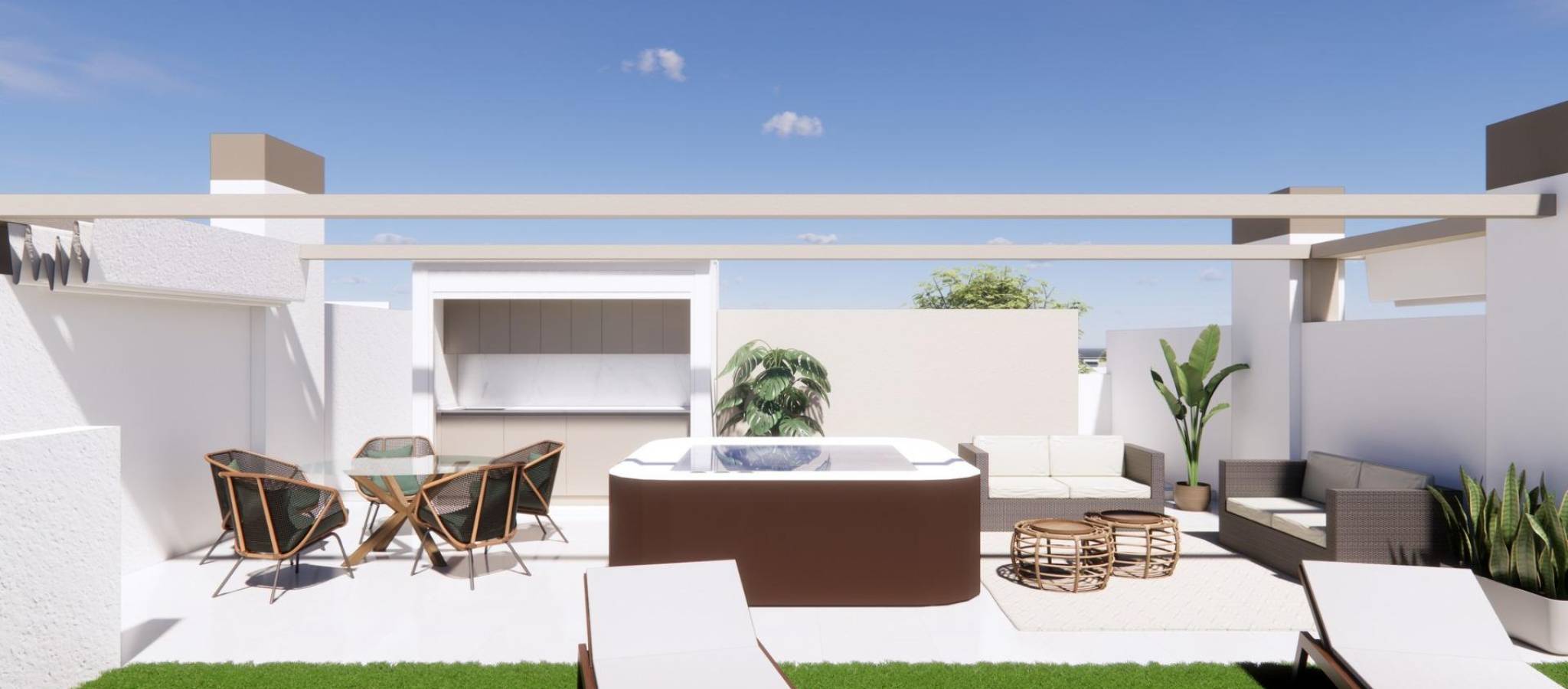 Top floor bungalows include a spacious terrace and a private rooftop solarium. The solarium comes with a summer kitchen and offers the option to add a private pool or jacuzzi at an extra cost, making it an ideal space to relax while enjoying the warm Mediterranean climate and open views.