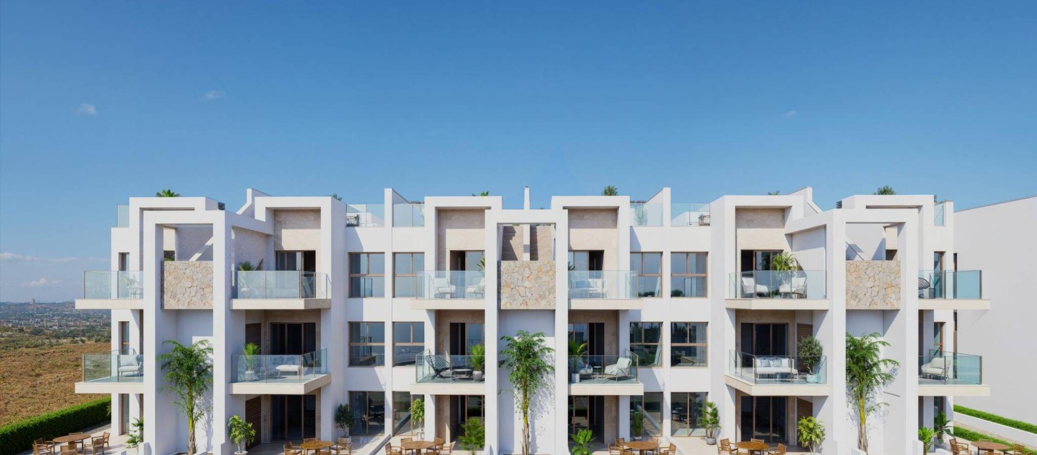 New Build Resort Apartments at La Serena Golf-Los Alcazares Near the Beach Modern Golf Front Living on the Costa Calida Discover this exclusive new build residential resort located at La Serena Golf in Los Alcazares. This contemporary development features 66 stylish apartments with 2 or 3 bedrooms and 2 bathrooms, one of them en suite, designed to offer comfort, elegance and an exceptional Mediterranean lifestyle just 300 meters from the Mar Menor. Los Alcazares is a charming coastal town known for its relaxed atmosphere, sandy beaches and long seaside promenade. With more than 300 days of sunshine per year, the area offers a perfect environment for outdoor living, water sports and golf. The town also provides a wide selection of restaurants, shops, marinas and sports facilities, making it a highly desirable destination for both permanent residence and holiday homes. Apartments with Terraces, Gardens and Private Solariums The residential complex offers several property types to suit different lifestyles. Buyers can choose between ground floor apartments with private gardens, middle floor homes with spacious terraces or penthouses with terraces and large rooftop solariums. The solariums include an outdoor shower and offer the option to add a summer kitchen and private jacuzzi, creating an ideal space for relaxation and entertaining while enjoying open views of the golf course and surrounding landscape. Each home has been designed with bright interiors and open plan living spaces that connect seamlessly with the outdoor areas. Resort Style Amenities and Exceptional Communal Areas One of the most distinctive features of this development is its resort style concept. Residents can enjoy a spectacular lagoon style swimming pool of approximately 190 m2 with beach style access and relaxing areas with Balinese beds. Additional communal facilities include landscaped gardens, a spa area, gym and sauna located in the basement level. The complex also offers a children playground, two petanque courts and communal restrooms near the pool area, creating a welcoming environment for residents and guests. Quality Finishes and Modern Features The apartments are built with modern materials and high quality specifications designed for comfort and style. Fully equipped kitchen with white glass finish appliances Bathrooms with vanity units, shower screens and backlit mirrors Motorized window shutters Basic lighting package Fully installed ducted air conditioning Underground parking space for each property Underground bicycle parking and optional storage rooms Prime Location Close to Beach and Golf Mar Menor beach 0.3 km La Serena Golf next to the development Los Alcazares town center 2 km Cartagena 22 km Murcia 40 km Region de Murcia International Airport 30 km Alicante Elche Airport 90 km The calm and shallow waters of the Mar Menor are ideal for swimming, sailing and paddle surfing throughout the year. Secure Your Home at La Serena Golf Resort These modern apartments combine beachside living, golf views from most units and resort style amenities in one of the most attractive areas of the Costa Calida. Contact us today to receive more information or arrange a visit and secure your new home in La Serena Golf-Los Alcazares.