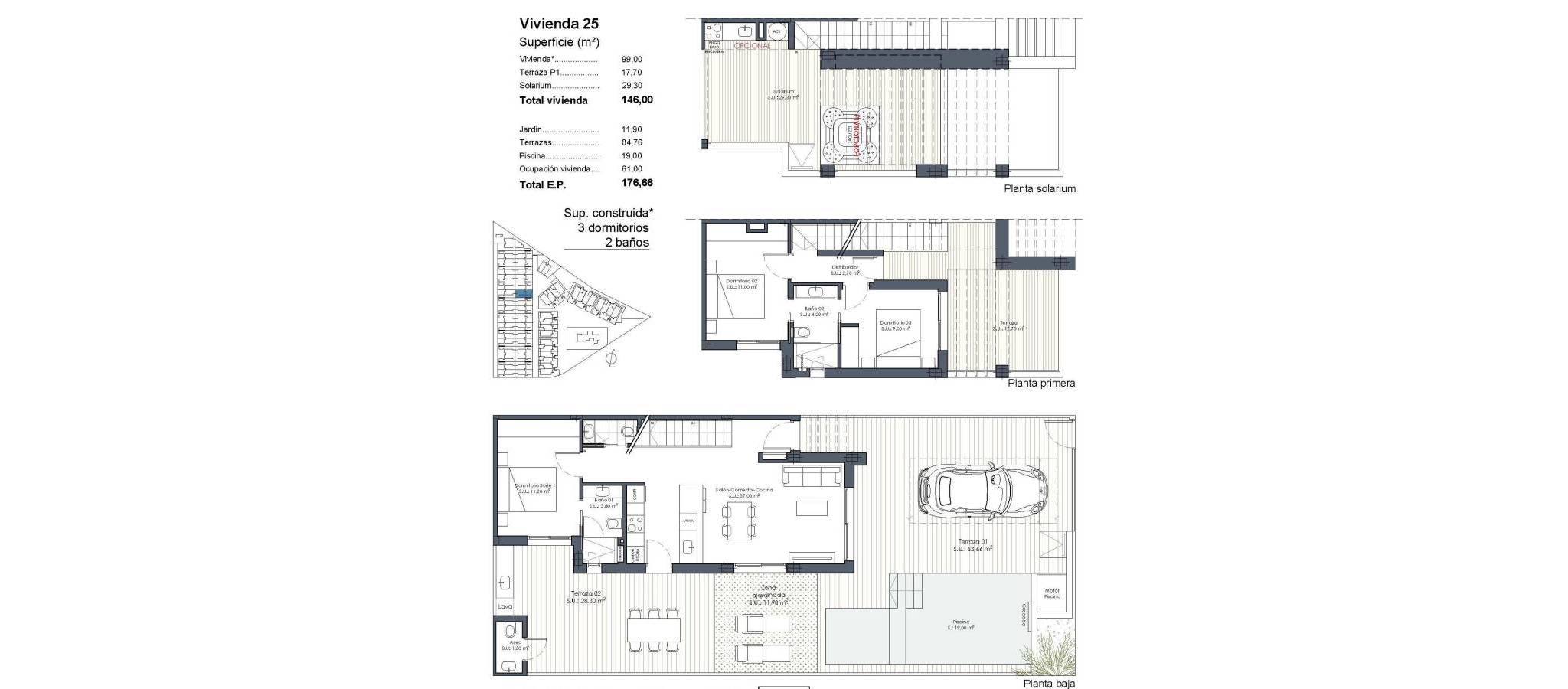 New Build Villas with Private Pool at Serena Golf-Los Alcazares Boutique Collection of Modern Homes Near the Sea Discover an exclusive boutique development of 37 modern quad and semidetached style villas located at La Serena Golf in Los Alcazares on the beautiful Costa Calida. These contemporary homes are designed for buyers seeking privacy, sunshine and an outdoor lifestyle just 300 meters from the warm waters of the Mar Menor. Los Alcazares is a charming coastal town known for its long promenade, sandy beaches and relaxed Mediterranean atmosphere. The area enjoys more than 300 days of sunshine per year and offers excellent restaurants, shops, marinas and sports facilities. Its location between the sea and the golf course makes it one of the most desirable destinations in the region for both permanent living and holiday homes. Modern Villas with Private Pool and Outdoor Living Each property features a private plot with its own swimming pool, creating the perfect environment to enjoy the Mediterranean climate throughout the year. The homes include 3 bedrooms and 2 or 3 bathrooms plus guest toilets, offering comfortable and functional living spaces ideal for families or guests. The villas are designed to emphasize outdoor living. Next to the pool there is a barbecue area and an exterior guest toilet, perfect for entertaining friends and family. The rooftop solarium offers additional space to relax in the sun and includes a solar shower with pre installation for a jacuzzi and summer kitchen. Parking is included both within the private plot and with an assigned underground parking space. High Quality Finishes and Modern Features The homes are built with modern materials and quality specifications designed for comfort and style. Fully equipped kitchen with appliances in white glass finish Bathrooms with backlit mirrors, shower screens and vanity units Motorized window shutters Basic lighting package Fully installed ducted air conditioning These features ensure a comfortable living experience whether the property is used as a main residence or holiday home. Resort Style Amenities and Excellent Location Owners also enjoy access to shared resort style facilities with a neighboring development. These amenities include landscaped gardens, a lagoon style communal pool, spa area, gym and sauna. The location offers easy access to beaches, golf courses and nearby cities. Mar Menor beach 0.3 km La Serena Golf next to the development Los Alcazares town center 2 km Cartagena 22 km Murcia 40 km Region de Murcia International Airport 30 km Alicante Elche Airport 90 km The shallow waters of the Mar Menor are perfect for swimming, sailing, paddle surfing and other water sports all year round. Secure Your Mediterranean Lifestyle in Los Alcazares These new build villas offer the perfect combination of beach, golf and modern comfort on the Costa Calida. Contact us today to receive more information or arrange a visit and secure your new home at Serena Golf in Los Alcazares.