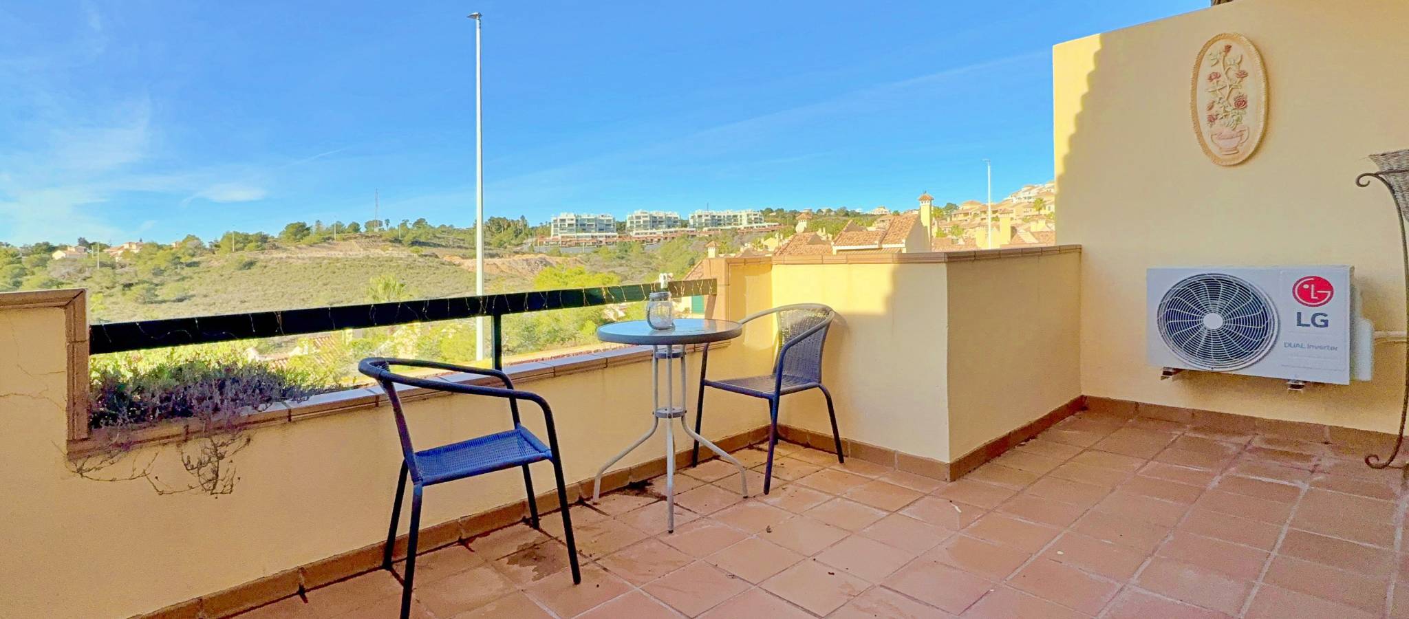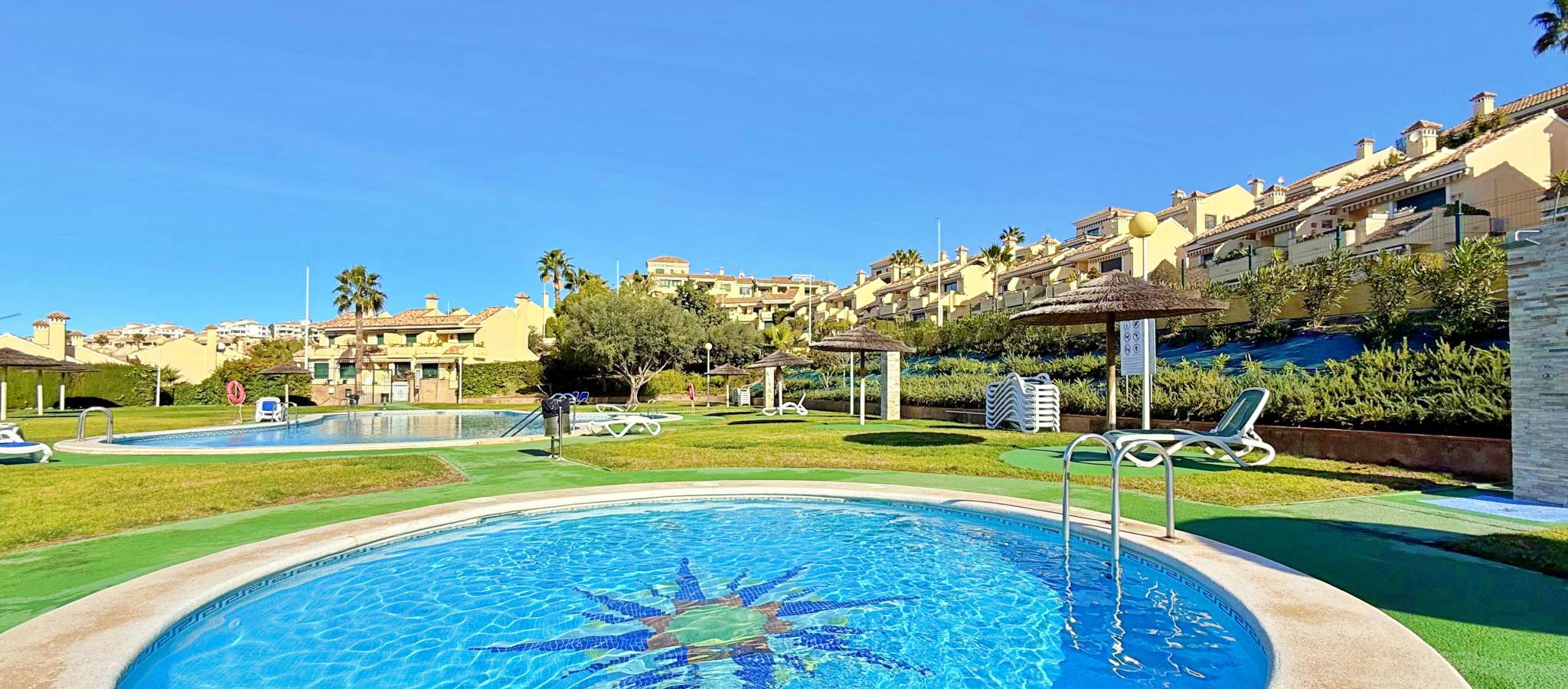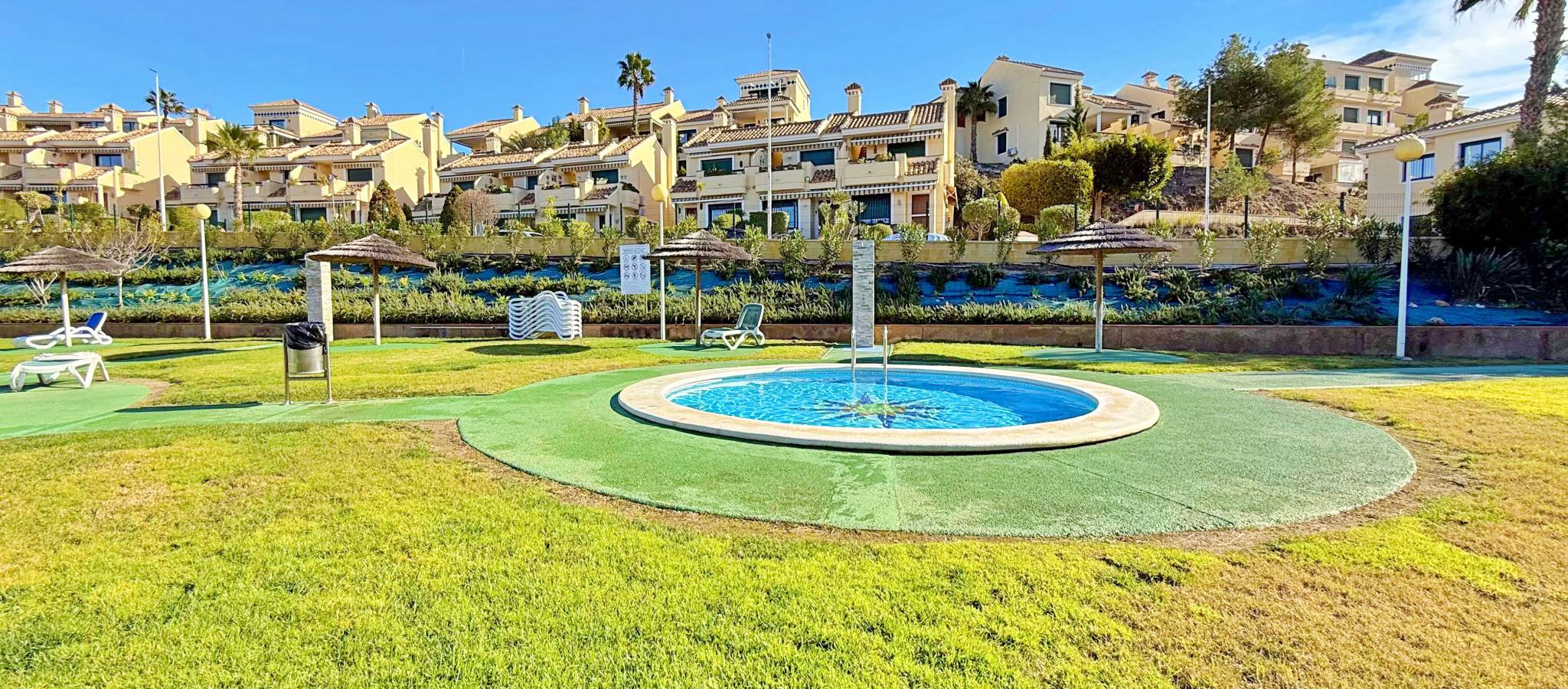 This townhouse in Lomas de Campoamor stands out for its southwest orientation and excellent use of outdoor spaces, designed to enjoy the afternoon sun and sunsets. With 83 m² of living space, it offers a functional layout of 2 bedrooms and 2 bathrooms, is in good condition, and comes equipped with air conditioning. The property's key value lies in its three outdoor areas: a 25 m² garden plot at the entrance, a 15 m² rear porch, and a 33 m² rooftop solarium, offering unobstructed direct views of the golf course. The complex features green areas and a large communal swimming pool. Its location is strategic for golfers and holidaymakers alike: just 500 meters from the Real Club de Golf Campoamor and adjacent to commercial areas with supermarkets and restaurants, offering all amenities within walking distance without sacrificing the tranquility of the surroundings.