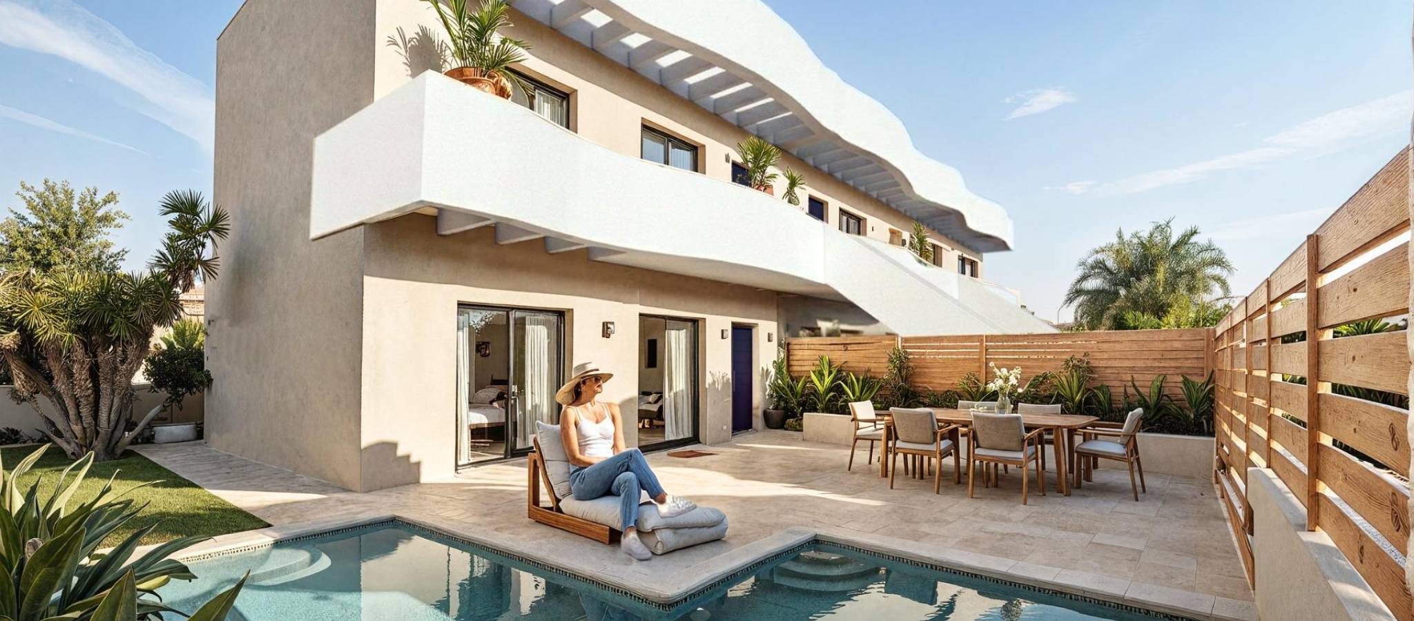 Boutique New Build Bungalows with Private Pool in Pilar de la Horadada, 2 km from beach Exclusive Development Near the Beach on the Costa Blanca Discover this boutique residential development of only six modern bungalows in Pilar de la Horadada, a charming coastal town located in the southern Costa Blanca. Just 2 km from the beautiful sandy beaches of Torre de la Horadada, this project offers a perfect blend of contemporary design, comfort and prime location. Situated in a central and well connected residential area, these homes are within walking distance of the town center, where you will find a wide range of shops, restaurants, cafes and all essential services. Pilar de la Horadada is known for its traditional Spanish atmosphere, welcoming community and relaxed Mediterranean lifestyle. Modern Bungalows with Private Outdoor Spaces All properties feature three bedrooms and two bathrooms, including a master bedroom with en suite bathroom. Buyers can choose between ground floor and top floor layouts, each offering unique outdoor living options. Ground floor bungalows include a private garden, private swimming pool and on plot parking, ideal for those seeking space and easy access. Top floor properties offer a private terrace and a rooftop solarium with private pool, as well as a designated parking space at ground level. The interiors are designed with open plan living areas, combining kitchen, dining and lounge spaces to maximize natural light and create a seamless flow throughout the home. High Quality Finishes and Contemporary Features These new build homes are constructed using high quality materials and finishes. Features include smooth plaster walls, porcelain flooring throughout and built in wardrobes. The modern open kitchens come fully furnished and equipped with appliances. Additional features include pre installation for ducted air conditioning, aerothermal system for energy efficient hot water, LED lighting package, electric shutters and video intercom system. Bathrooms are fully fitted with vanity units and mirrors, offering both style and functionality. Prime Location Close to Beaches, Golf and Amenities Pilar de la Horadada offers an ideal location for both permanent living and holiday homes. The nearby beaches of Torre de la Horadada are approximately 2 km away, known for their golden sand and clear waters. Other key points of interest include Lo Romero Golf 6 km, La Zenia Boulevard shopping center 15 km, Murcia Corvera Airport 40 km and Alicante Airport 55 km. The area also benefits from excellent road connections to nearby coastal towns, marinas and leisure facilities. Ideal Investment Opportunity on the Costa Blanca This exclusive development offers a rare opportunity to own a stylish new build bungalow in a highly desirable location close to the sea. Contact us today for more information or to arrange a viewing and secure your new home in Pilar de la Horadada.