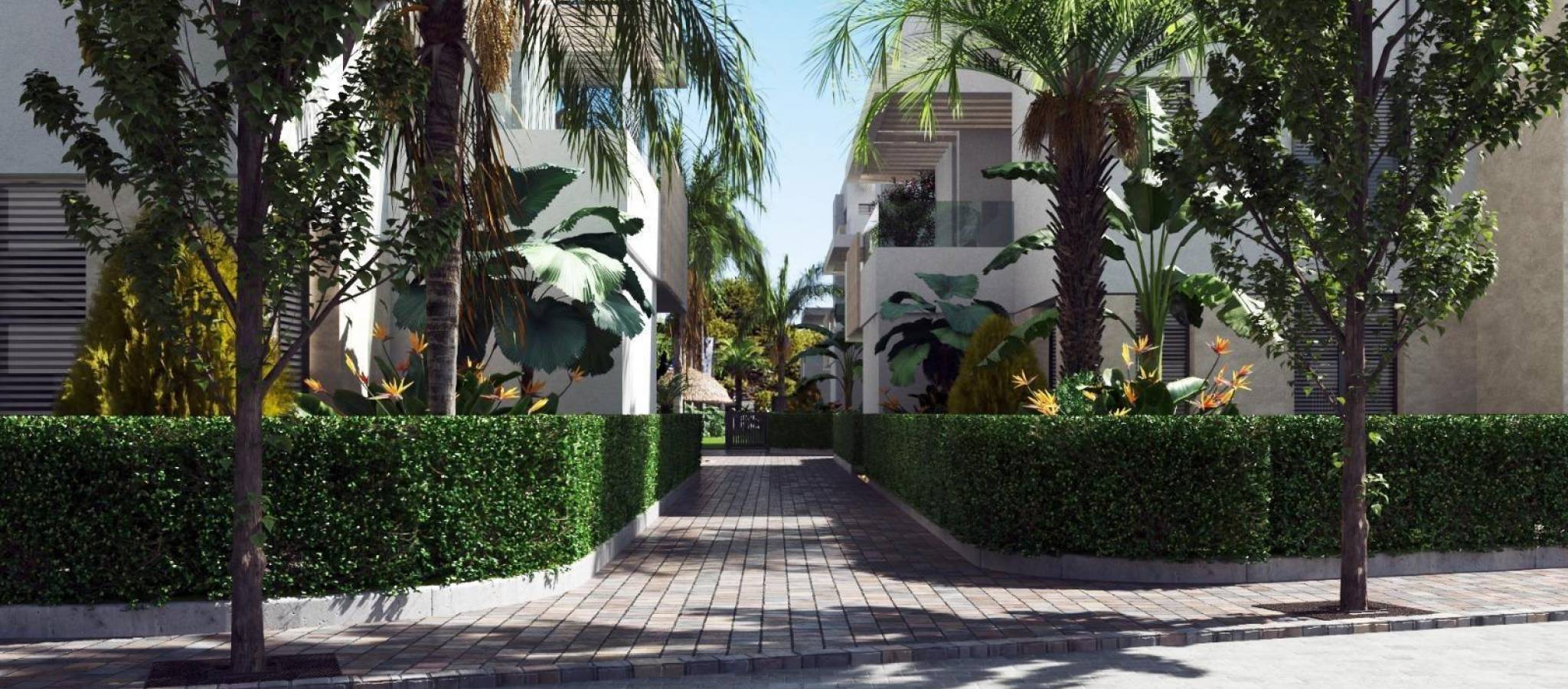 NEW BUILD APARTMENTS IN PRIVATE GATED RESORT IN PROVINCE OF MURCIA New Build residential complex of 6 blocks, a total of 42 apartments. Beautiful apartments have 3 and 2 bedrooms and 2 bathrooms with views of the large lake and green areas of this large luxury resort. Ground floor apartments with private garden, top floor apartments with private solarium. Complex has a communal pool and all the apartments have a parking pace and a storage room. Located in a private gated resort, with a main access entrance and 24 hours security. The resort is designed around an impressive 126.000 m2 green area. It comprises walking and cycling paths, sport facilities, paddle and tennis courts, a mini-golf course, gardens, dog parks, leisure areas, clubhouse…. Also in the central area is the jewel of the resort, a crystal-clear artificial lake of almost 17.000m2 of water surface, surrounded by white sandy beaches and palm trees, bringing a piece of the Caribbean to the Murcia Region. There are 2 islands in the lake, one of them has its own bar, there are also “beach Chiringuitos” spread around the lake. The resort is strategically located less than 4 km from the beach and the town of Los Alcázares, where you can practice various water sports, surrounded by several golf courses and the city of Cartagena less than 15 minutes by car and 22 km from Murcia airport, therefore having a wide cultural, gastronomic and sports offer within reach.