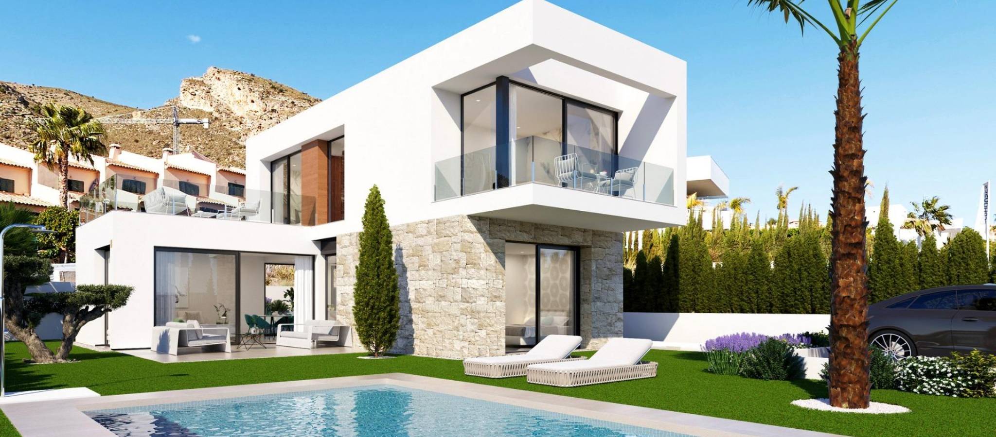 Luxurious New-Build Villas in Sierra Cortina, Finestrat Explore the elegant new development of independent villas in the exclusive neighborhood of Sierra Cortina, Finestrat. Nestled in a picturesque area close to Benidorm, these premium properties offer modern living spaces and top-notch amenities. With easy access to the Mediterranean coast, these villas are ideal for anyone seeking a blend of luxury, comfort, and convenience. Just 5 km from the vibrant city center of Benidorm, this development also places you within a short distance of major points of interest. Spacious and Modern Villas with 3 or 4 Bedrooms Each villa in this new development features 3 or 4 bedrooms and 3 luxurious bathrooms, creating ample space for family and guests alike. The heart of these homes is the open-plan living and dining area, connected to a sleek, integrated kitchen. This versatile space is perfect for family gatherings and entertaining, providing a cozy yet contemporary ambiance. Some units also include a basement area that can be customized into a gym, home cinema, or recreational area, offering endless possibilities for personalization. Advanced Home Automation and Energy-Efficient Design These villas are designed with the latest in smart home technology. Fully automated with a state-of-the-art home automation system, residents can control lighting, blinds, and air conditioning with ease. Safety is also a priority, with integrated flood and fire detection systems, a video intercom, and remote security features. To ensure energy efficiency, the villas make use of natural light, cross ventilation, wind protection, and water conservation features, reducing energy costs while maintaining a comfortable living environment. Private Outdoor Spaces with Pool and Landscaped Gardens Enjoy the Mediterranean climate with a private garden that serves as a personal oasis. Each villa features a private swimming pool, ideal for cooling off on warm days or hosting summer gatherings. The landscaped garden is adorned with natural grass and trees, supported by an automatic irrigation system, and has tasteful exterior lighting to create a relaxing atmosphere after sunset. Prime Location Near Benidorm and Key Attractions These villas in Sierra Cortina offer proximity to key destinations. The lively beaches of Benidorm are just 4 km away, and Alicante-Elche Airport can be reached in approximately 50 km. Golf enthusiasts will find several prestigious courses nearby, such as Villaitana Golf, just 3 km away. For shopping and dining, La Marina Shopping Center is within a 2 km drive, providing access to a variety of retail, dining, and entertainment options. Luxury Living in Sierra Cortina – Reserve Your Dream Home Today Discover a blend of elegance, comfort, and advanced technology in these new-build villas at Sierra Cortina. Don’t miss the chance to own a home in one of the most sought-after locations on the Costa Blanca. Contact us today to arrange a visit and experience the lifestyle that awaits you.