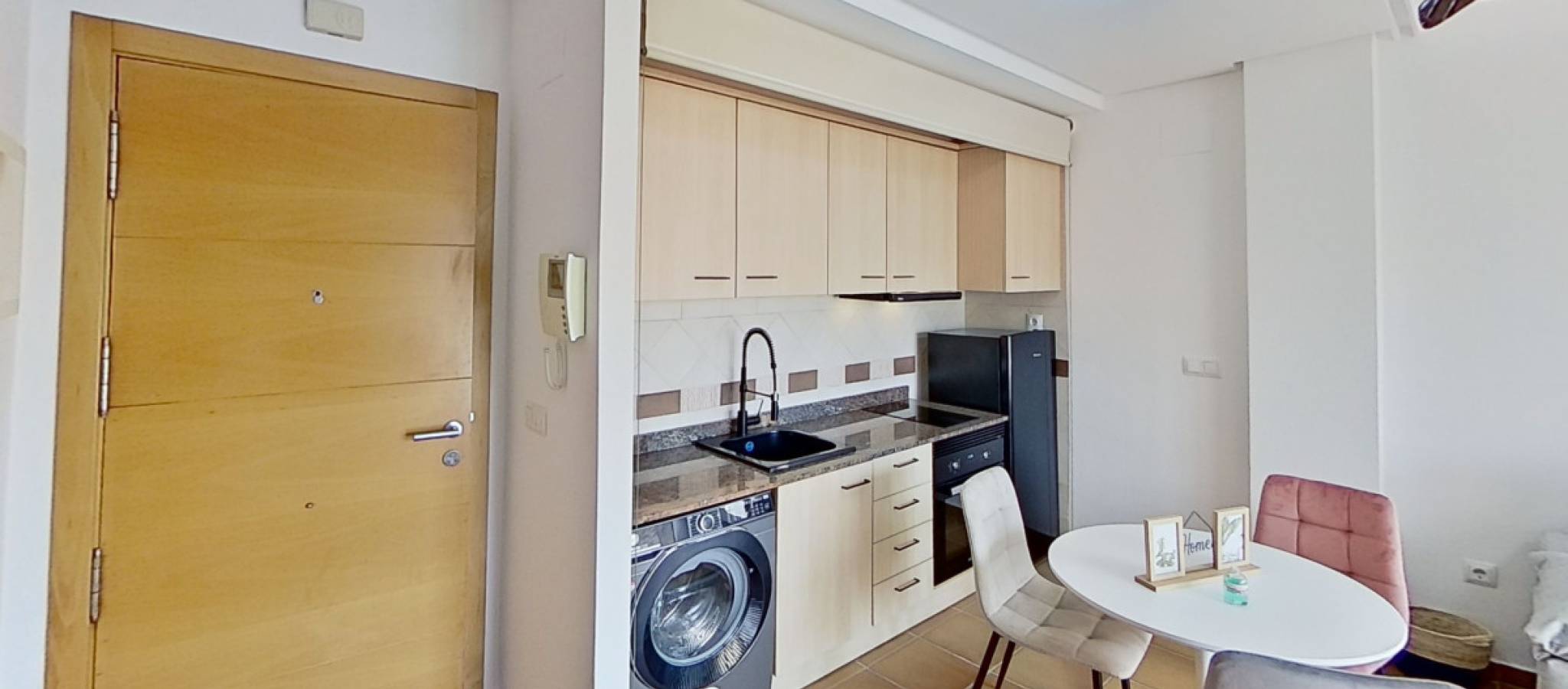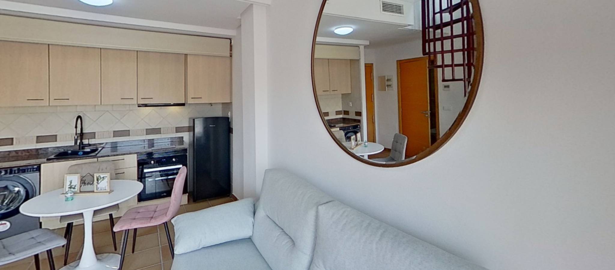 Exclusive homes with extensive common areas, spa, pools, and much more by the Mediterranean Discover a residential complex designed to enjoy comfort, well-being, and quality of life all year round. With 1-bedroom homes offering excellent qualities, spacious terraces, and direct access to unmatched common areas. The 1-bedroom apartments feature a practical integrated kitchen concealed within a cabinet with doors or a shutter, providing the same amenities and appliances. All kitchens come with upper and lower cabinetry in oak wood or similar, a centrifugal extractor hood, and a national granite countertop. The exterior carpentry combines functionality and aesthetics, with anodized aluminum profiles in burgundy or similar colors, double glazing Climalit type, and integrated shutters in the bedrooms. The sliding doors in the living room allow for complete opening to integrate the interior and exterior, enhancing the spaciousness of the areas. The interior features varnished wood finishes, built-in wardrobes lined and fitted matching the carpentry, and a high-security entrance door with multi-point lock and anti-lever hinges. What truly makes this project special are its spectacular common areas: two outdoor pools — one for children and another for adults with a beach area — surrounded by extensive solariums and covered and semi-covered areas with pergolas. An indoor heated pool, fully accessible, is part of the exclusive spa that includes waterfalls, water cannons, a communal jacuzzi, sauna, and relaxation area. The complex also offers a complete gym with professional equipment, a medical and physiotherapy area, a closed Pitch & Putt for golf lovers, a bowling green, a children's area, and a charming reading area with pergolas, all connected by landscaped boulevards that provide privacy and harmony among spaces. Each home includes a parking space and an adjoining storage room of approximately 6 m². An ideal option both as a permanent residence and a second home, where every detail has been designed to offer a unique experience by the sea.