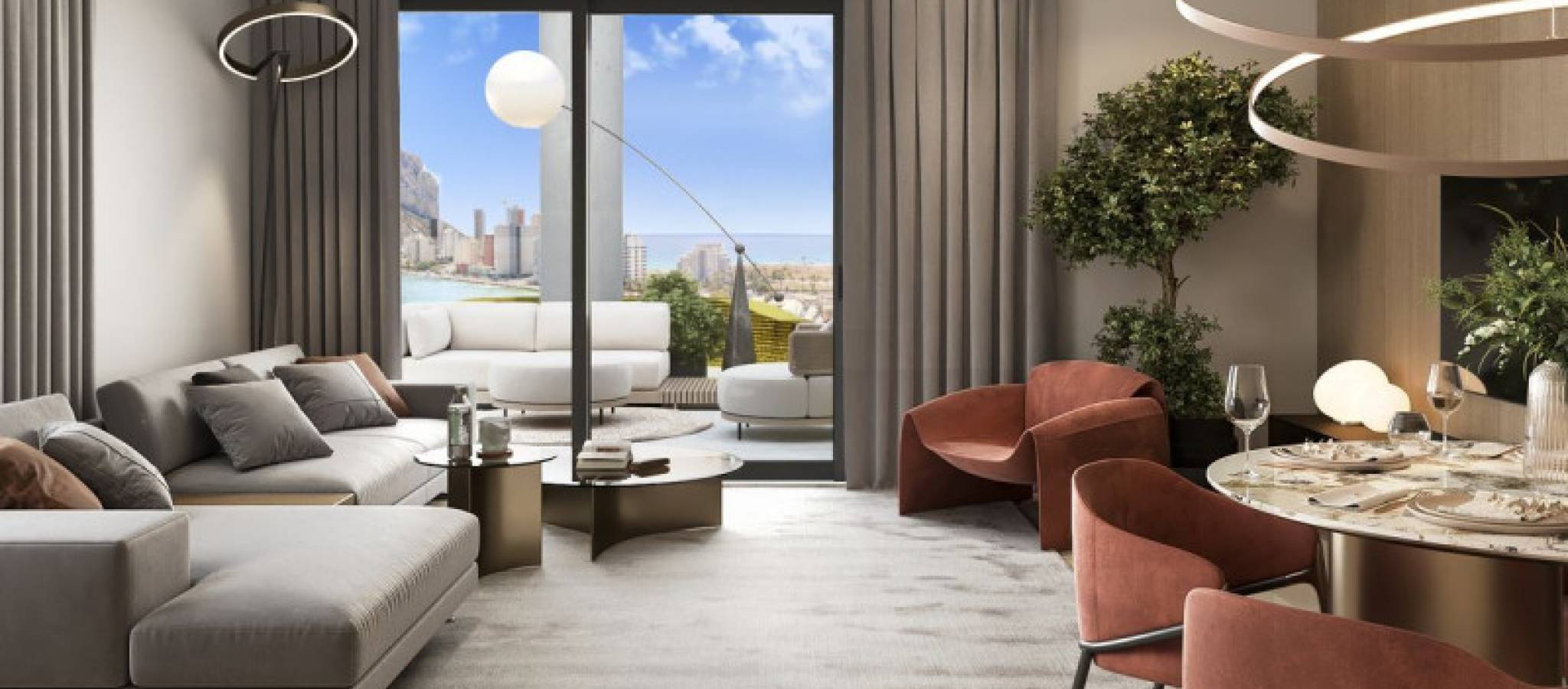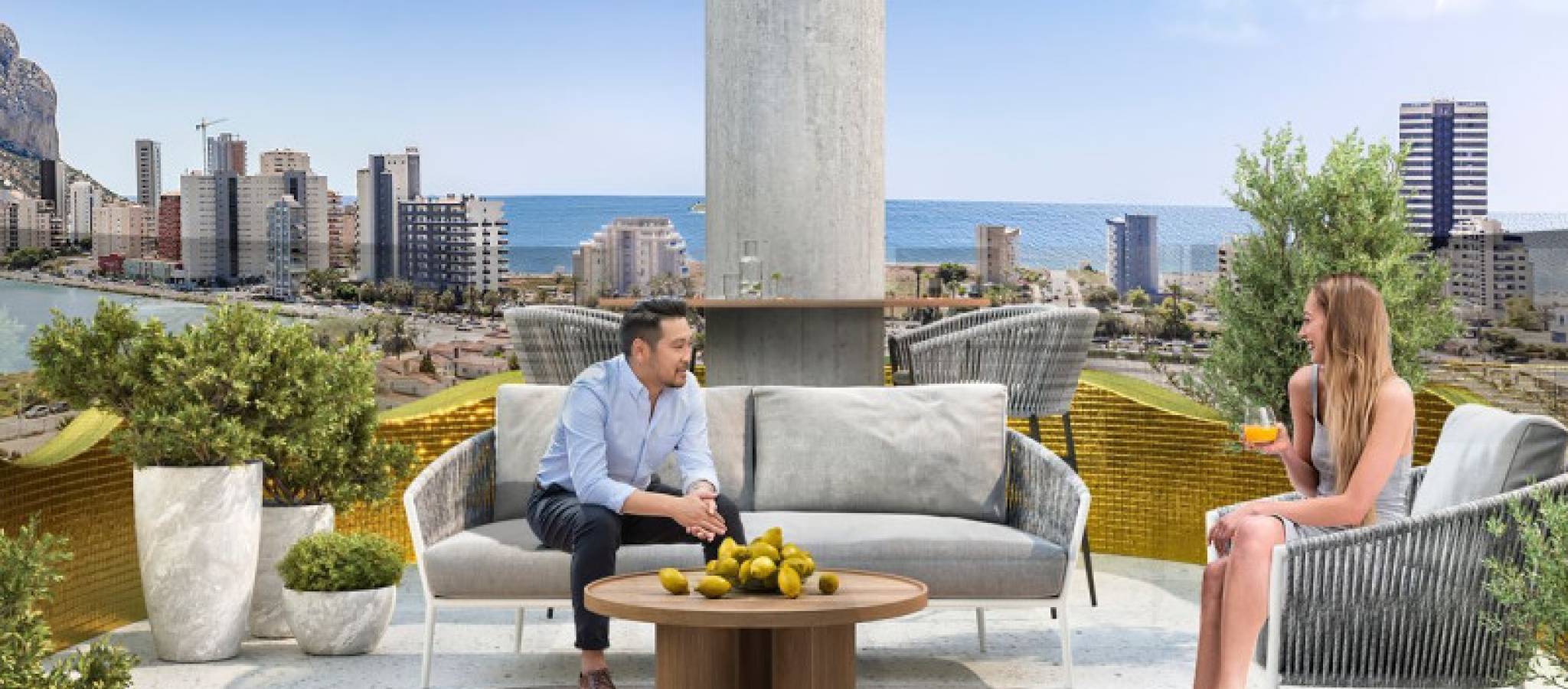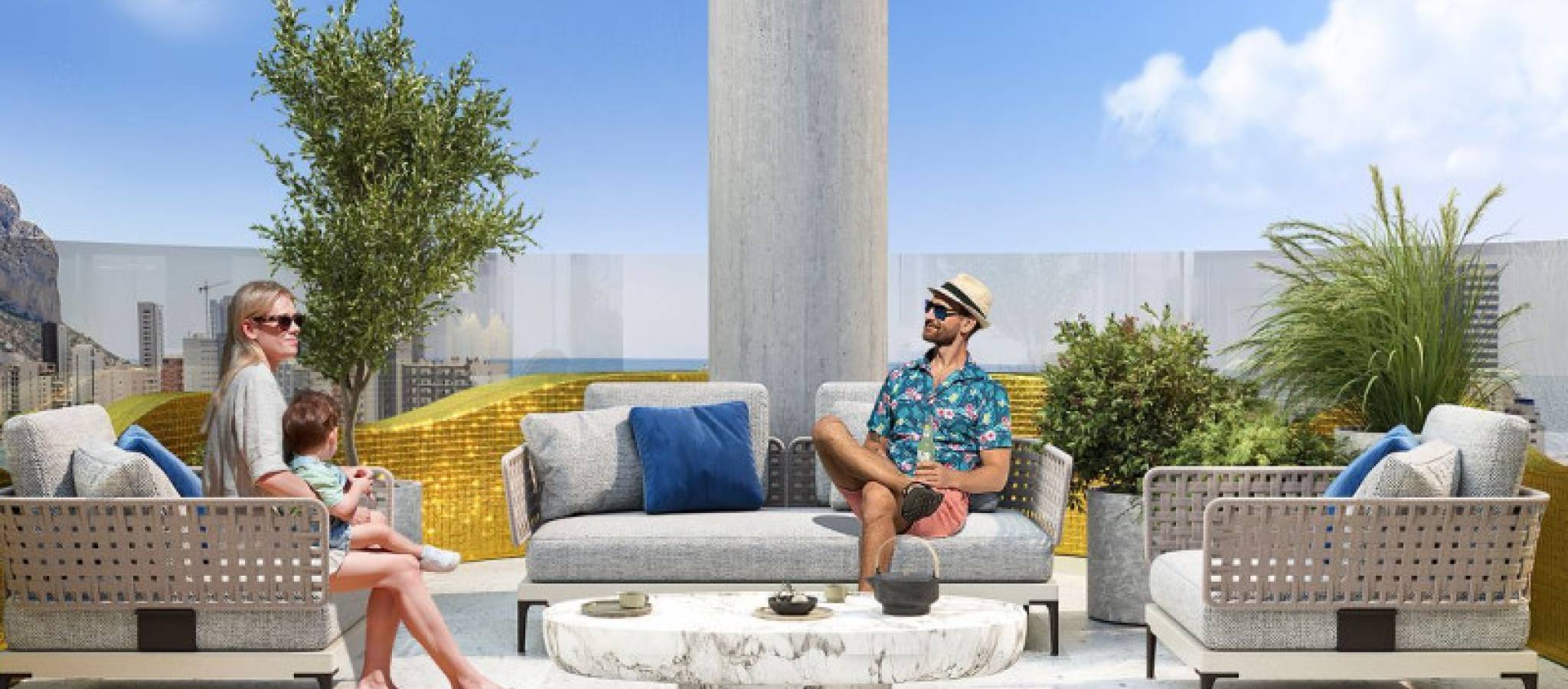 Discover the stunning residences offering expansive terraces that provide breathtaking, panoramic views of the best that life in Calpe has to offer, including its famous beaches and iconic landmarks. Imagine waking up every morning to scenes of unparalleled beauty, transforming your lifestyle into one that feels as if it's integrated within the skies over Calpe. The serene lagoon is just a short distance away, with only a school plot separating you from its tranquil waters. Enjoy luxurious amenities such as a swimming pool, paddle tennis, a state-of-the-art gym, calisthenics area, and children's playgrounds, all set within spacious communal areas that enhance your living experience. The building's extraordinary design is highlighted by a striking central structure, featuring ceramic cladding in white and golden marble textures. From this axis emerge terraces that glisten with bold and luminous gold. Your dream home, your new life in Calpe, awaits you! The construction of these exceptional residences is already underway!