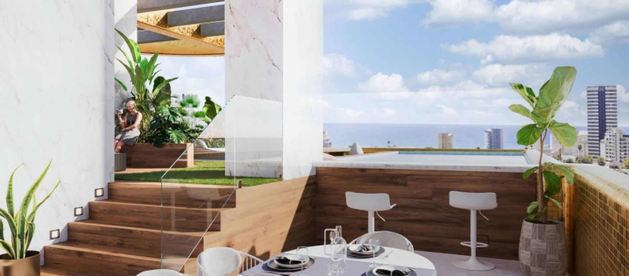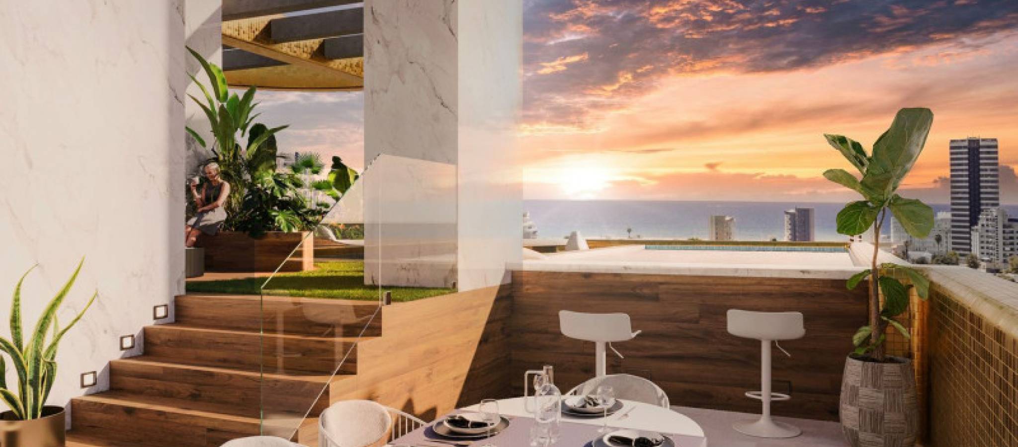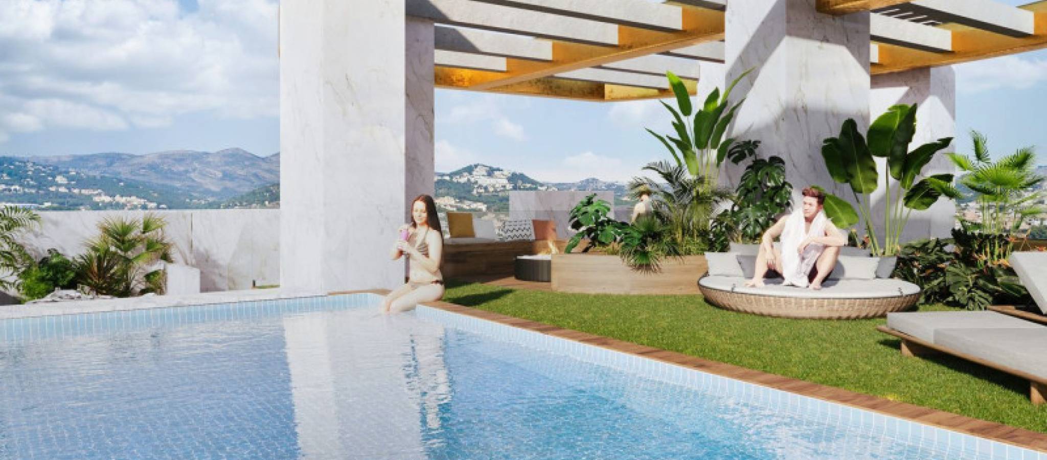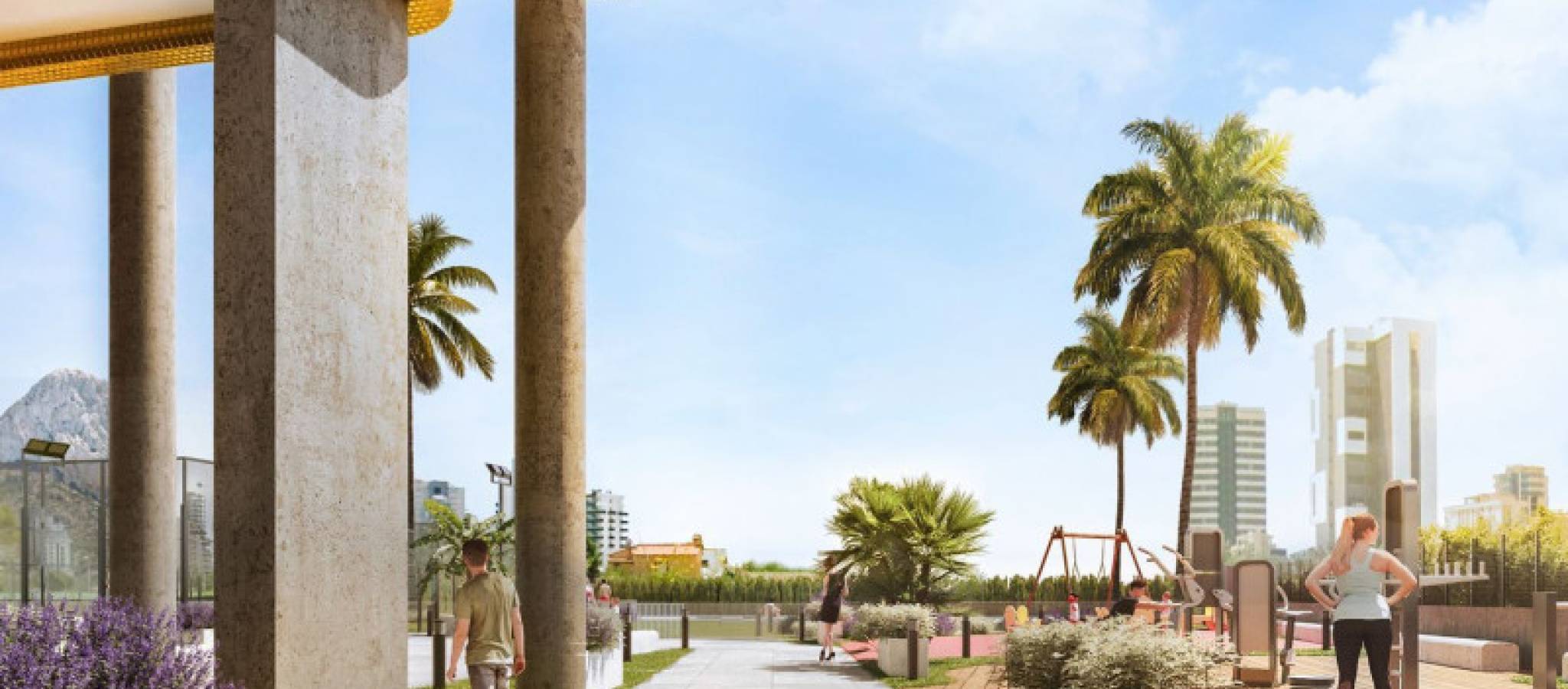 Discover the stunning residences offering expansive terraces that provide breathtaking, panoramic views of the best that life in Calpe has to offer, including its famous beaches and iconic landmarks. Imagine waking up every morning to scenes of unparalleled beauty, transforming your lifestyle into one that feels as if it's integrated within the skies over Calpe. The serene lagoon is just a short distance away, with only a school plot separating you from its tranquil waters. Enjoy luxurious amenities such as a swimming pool, paddle tennis, a state-of-the-art gym, calisthenics area, and children's playgrounds, all set within spacious communal areas that enhance your living experience. The building's extraordinary design is highlighted by a striking central structure, featuring ceramic cladding in white and golden marble textures. From this axis emerge terraces that glisten with bold and luminous gold. Your dream home, your new life in Calpe, awaits you! The construction of these exceptional residences is already underway!