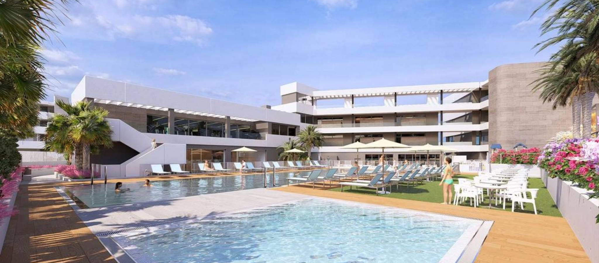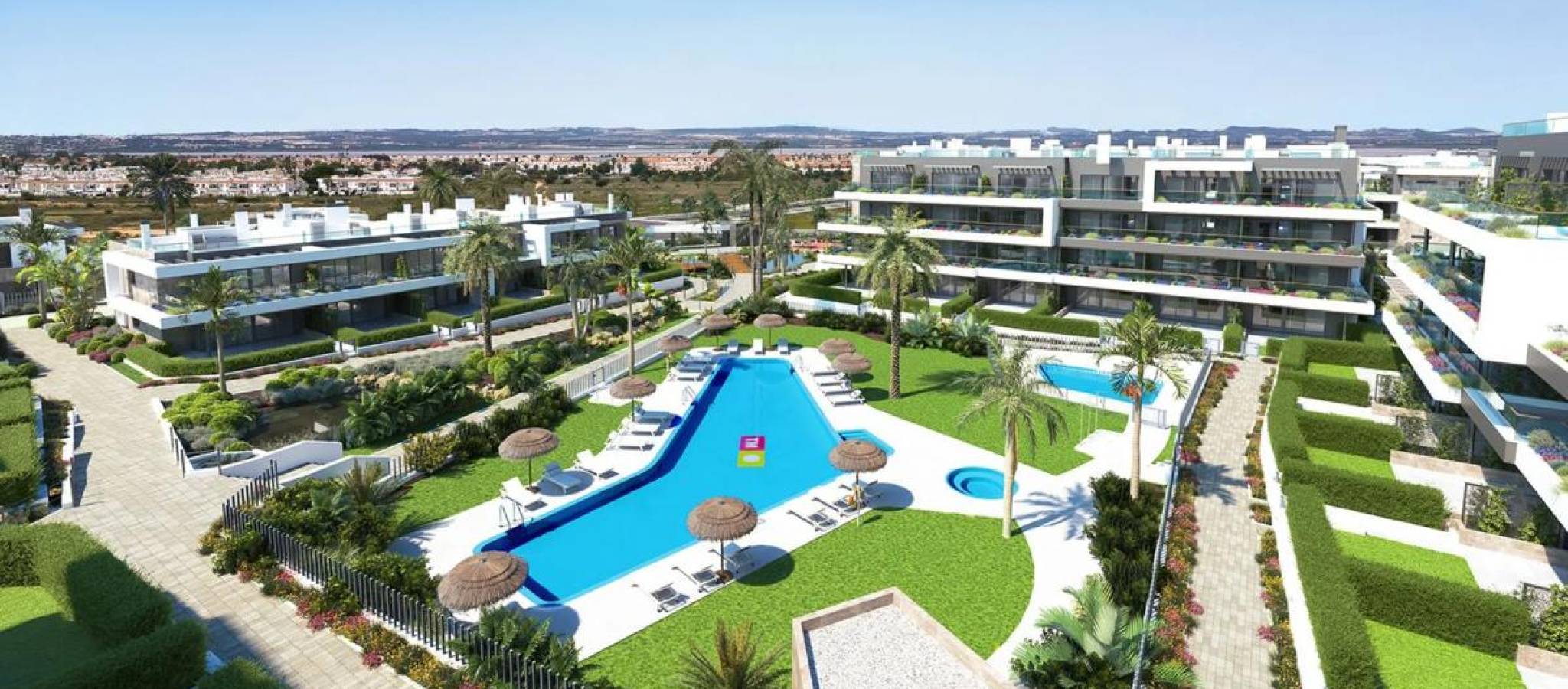 An exclusive residential complex situated between the Natural Park and the distinctive pink waters of the lagoon, offering a unique setting that combines nature, modern design, and Mediterranean quality of life. The project offers apartments, bungalows, and villas with various configurations of 1, 2, and 3 bedrooms and corresponding bathrooms. Ground floor properties feature private gardens, while the top floor residences include a solarium, all with spacious areas and abundant natural light. The villas come with landscaped plots, with the option of a private pool. Each property includes either an outdoor or underground parking space, with the option of storage depending on the type. Immediate delivery – Key readyCommunal areas and services The residential complex features more than 15,000 m² of communal areas designed for an active and healthy lifestyle. Notable facilities include: 2 adult swimming pools2 children’s pools2 heated jacuzzisChildren’s play areaPetanque courtsExtensive landscaped green areas with palm trees, aromatic plants, fountains, lakes, and pathways Most properties face southeast or southwest, ensuring good light throughout the day. Life in the city Torrevieja Living in this complex means enjoying a privileged natural setting with the salt lagoons as a backdrop. Its excellent location offers easy access to all services and points of interest on the coast. ???? Local highlights: Minutes away from the beaches of La Mata, Cabo Cervera, Cala Higuera, and Cala La ZorraEasy access to urban beaches such as Los Locos, El Cura, or Los Náufragos, and those in Orihuela Costa (La Zenia, Cabo Roig, Mil Palmeras, etc.)Proximity to a shopping centre, a hospital, the international auditorium, and the motorway40 minutes from Alicante-Elche International Airport and the AVE service in Alicante The area also offers natural routes for hiking and cycling around Lo Albentosa, as well as a wide range of gastronomic, cultural, and leisure activities. Activities and golf Sports enthusiasts can enjoy sailing, rowing, surfing, paddle surfing, flyboarding, and jet skiing at the marina in the city. Additionally, the surroundings host some of the best golf courses in the region, including: La Marquesa GolfVistabella GolfLa Finca GolfVillamartín Golf The project will also include a Sport & Wellness Club, a modern sports and wellness centre with indoor and outdoor facilities.